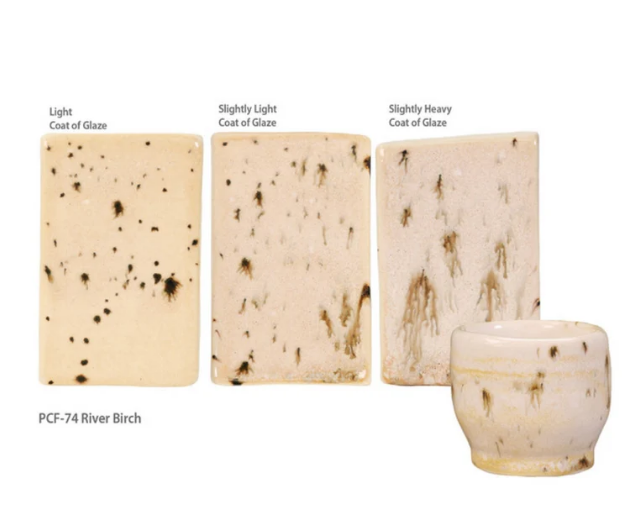 River Birch is a glossy cream glaze with runny dark specks like the bark of a tree.